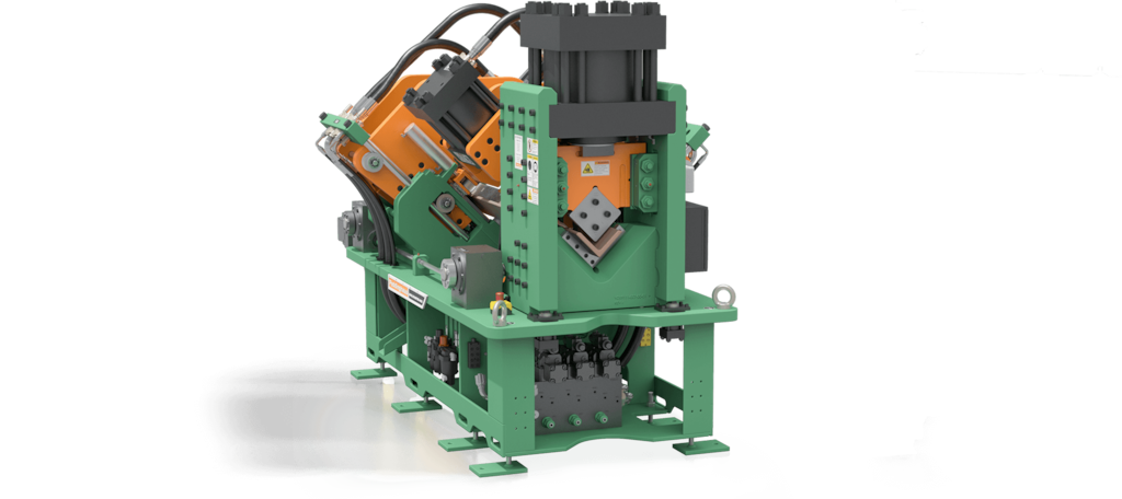 Three punch stations per hydraulic press allow the machine to apply up to three different hole shapes/sizes per leg. A new and improved punch tool design allows for quicker and easier tool changes. This angle line can accommodate shaped holes such as squares, rectangles, obrounds and slots, including a feature that allows nibbling of material for cutting large notches out of angle or flat bar.
