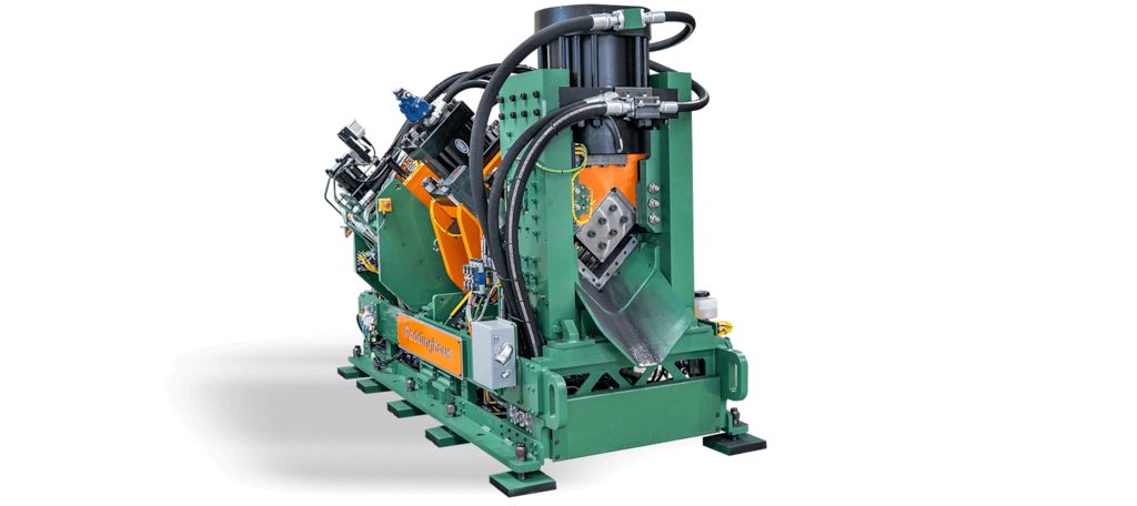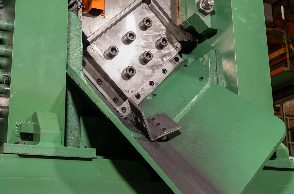 The Anglemaster-863 uses a single cut 527 ton shear press for the cutting to length angle and flat stock. A single cut shear mechanism eliminates the slug created by double cut shear mechanisms.