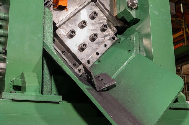 Two 169 ton punch cylinders each with three punch stations per hydraulic press allow the Anglemaster-863 to apply up to three different hole shapes/sizes per leg. This CNC angle line can accommodate shaped holes such as squares, rectangles, obrounds and slots.